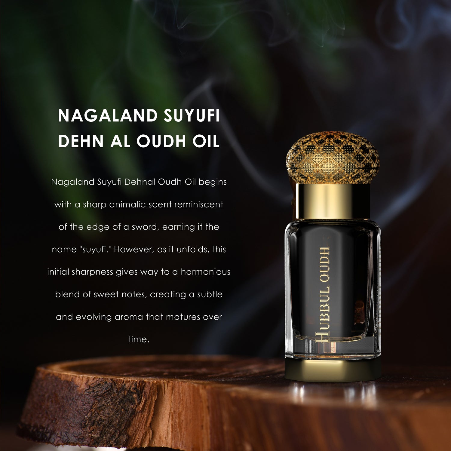 Nagaland Suyufi Dehnal Oudh Oils begins with a sharp animalic scent reminiscent of the edge of a sword, earning it the name Suyufi.