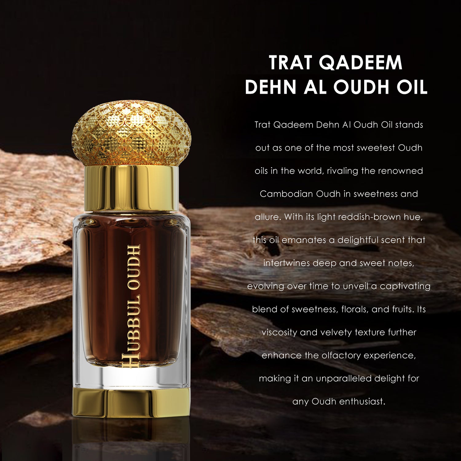 Trat Qadeem Dehn Al Oudh Oil stands out as one of the most sweetest Oudh oils in the world. Rivaling the renowned Cambodian Oudh in sweetness and allure